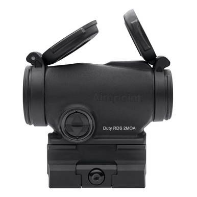 AimPoint Duty RDS The Aimpoint® Duty RDS is the red dot sight solution the world has been waiting for – offering Aimpoint quality at a more accessible price point. This compact, high-grade reflex optic was designed to meet the demanding needs of the modern law enforcement officer. The Duty RDS™ (Red Dot Sight) offers a bright, crisp 2 MOA dot that’s ideal for short to medium range target engagements. All new windage and elevation adjustments are flush mounted and waterproof, eliminating the need for protective caps. The turrets provide audible “clicks” when zeroing the optic. The dot brightness intensity switch is a digital keypad with intuitive buttons that can easily be manipulated while wearing gloves. The pressure forged aluminum alloy housing provides durability against extreme abuse and drastic temperature changes. The sight is vibration and shock resistant and submersible up to 80 feet. It is powered by a single CR2032 battery and ACET technology provides over 3 years of constant-on use at daylight position 7 and even longer on the night vision settings. The Duty RDS comes with a one-piece torsion nut mount and the optic features flip-up lens covers – the front is solid and the rear transparent. The sight is fully compatible with all generations of night vision devices. UNIQUE FEATURES 2 MOA red dot for precision and fast target acquisition Battery life: 30,000 hours (over 3 years) of constant operation with one battery on setting 7 Battery type: CR2032 battery (included) One-piece Torsion Nut Mount Flip-up lens covers – front is solid, and rear is transparent Advanced optical lenses for enhanced light transmission and ultimate dot clarity Windage and elevation adjustments are flush mounted and waterproof – eliminating the need for protective caps Hard anodized non-reflective surface 10 brightness settings: 1 off position, 4 night vision compatible settings, and 6 daylight settings 1X (non-magnifying) operationally parallax free optic Submersible to 80 feet (25 meters) Temperature span -49°F to +160°F Weight 3.8 oz / 108 g (sight only) Length x Width x Height 2.7 x 1.5 x 1.7 in / 68 x 37 x 43 mm