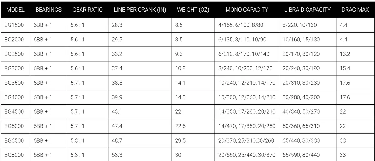 | Reel Size | BG 2000, BG 3000, BG 3500, BG 4000, BG 4500, BG 5000 (Out of Stock), BG 6500, BG 8000 |