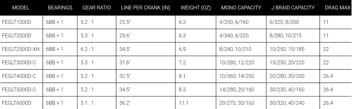 | Reel Size | Fuego LT 1000 (Out of Stock), Fuego LT 2000, Fuego LT 2500, Fuego LT 3000, Fuego LT 4000, Fuego LT 5000, Fuego LT 6000 |
