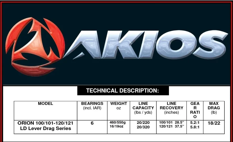 ORION LEVER DRAG 120 LD Akios has been working on these high quality lever drag reels for over 18 months and now the ORION 100 LD Lever Drag reel series is ready to do battle. The ideal reel for the avid boat angler who is looking for a high quality lever drag reel to marry up with a sport action boat rod. Two sizes of reel in the 100 & 120 sizes. The precision CNC produced reel has a high standard of finish and a superior smooth lever drag system. Quality CNC Machined Cage & Side Plates Anodized Dual Position Ergonomic Power Handle Power Torque Carbon/Stainless Lever Drag Line Capacity 100 250m/0.45mm – 220yds/20lb Line Capacity 120 450m/0.45mm – 360yds/20lb Gear Ratio – 100 is 5.2:1 – 120 is 5.8:1 Infinite Anti-Reverse System Brass Anti-Corrosion Chromed Side Plates 6+1 Stainless Steel Ball Bearings Brass Cut Gear System Line Out Alarm “Fish On Clicker” ***FREE SHIPPING***