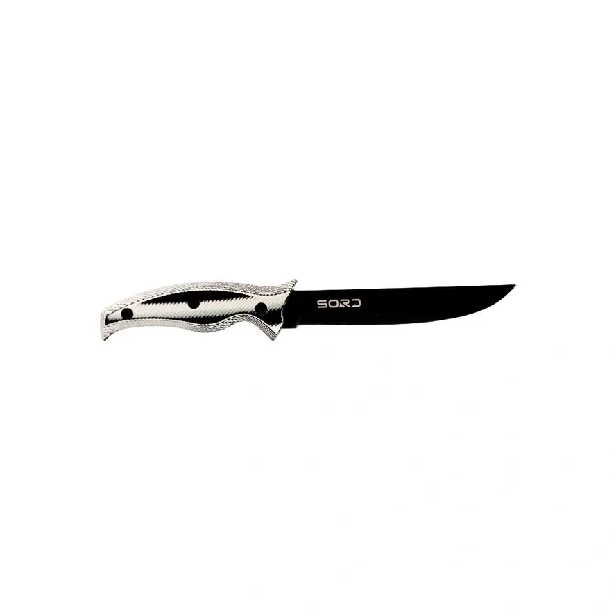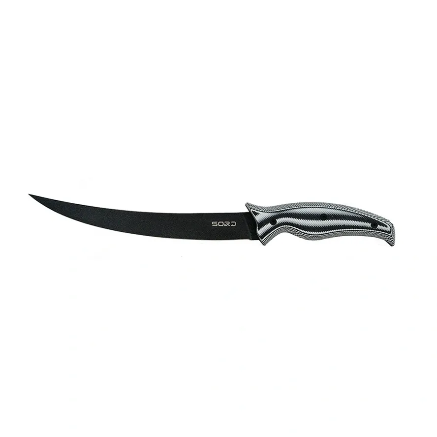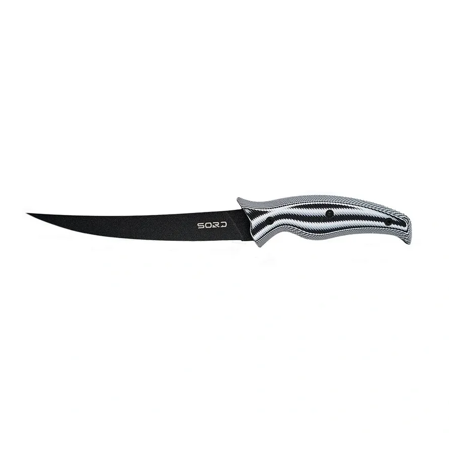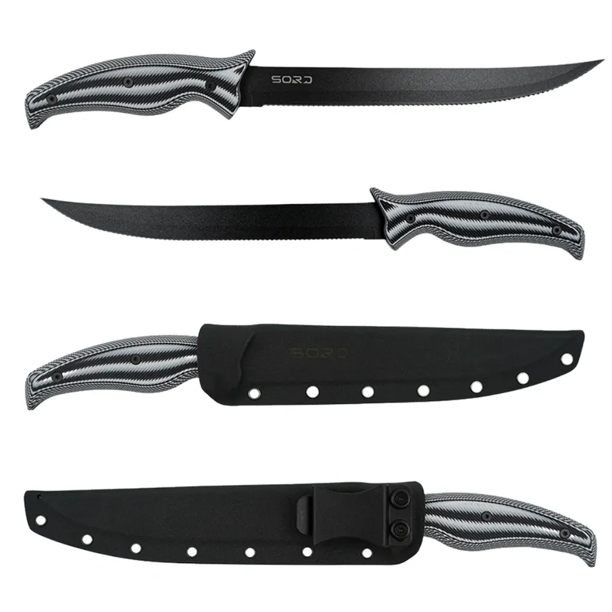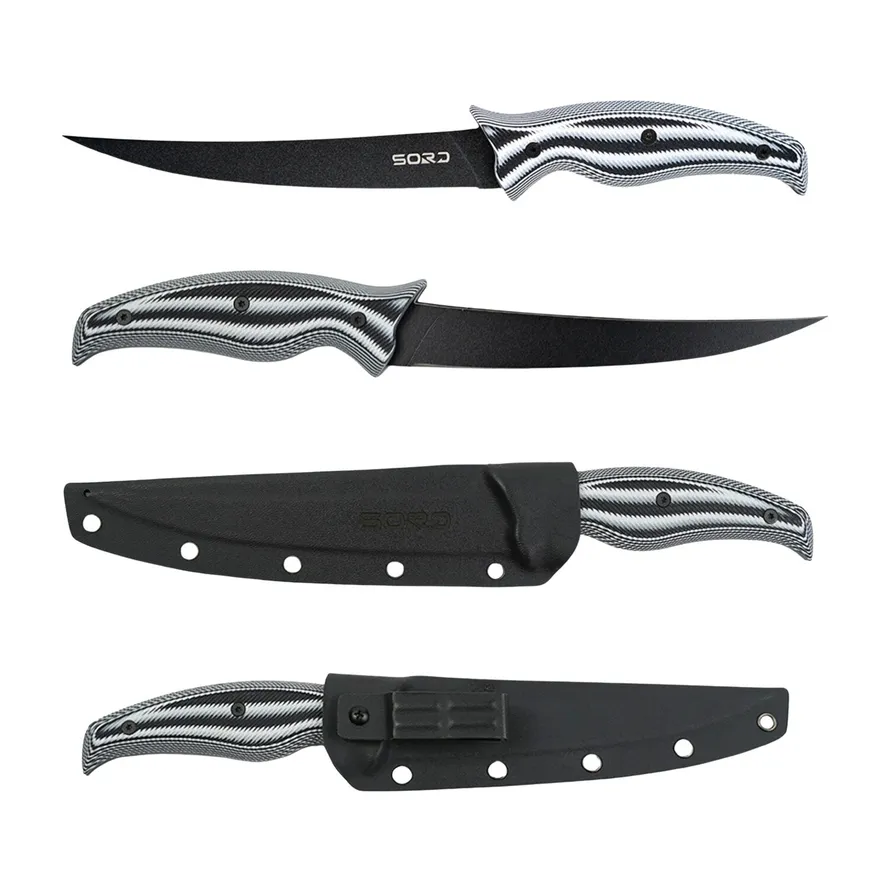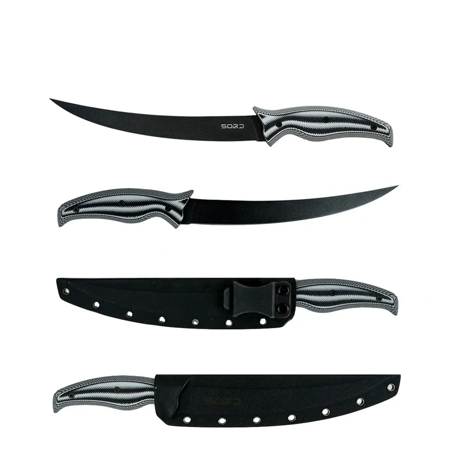 SORD Fillet Knives Features: G10 Handle custom engineered to and balanced to fit your hand. Carbon Steel Blade made to hold a long-lasting sharp edge. Medium and Flexy blade options to give you the choices needed for getting meat off the bone and the skin. Teflon + Titanium Coated for extreme corrosion resistance. Kydex Sheath that locks the knife in with a click. Belt Loop Clip to allow easy carry on your waste.